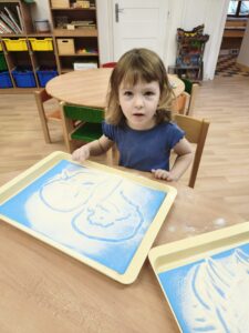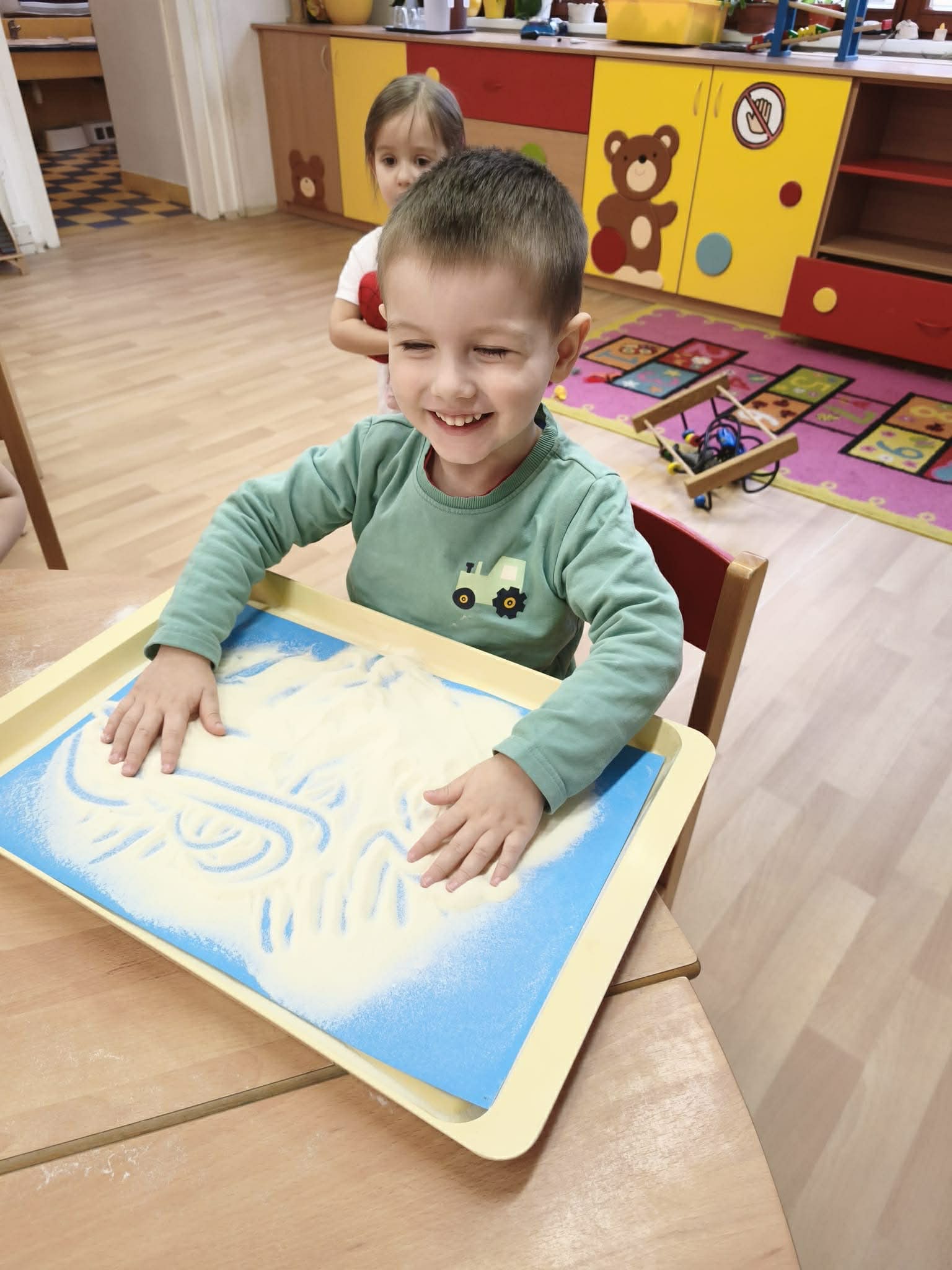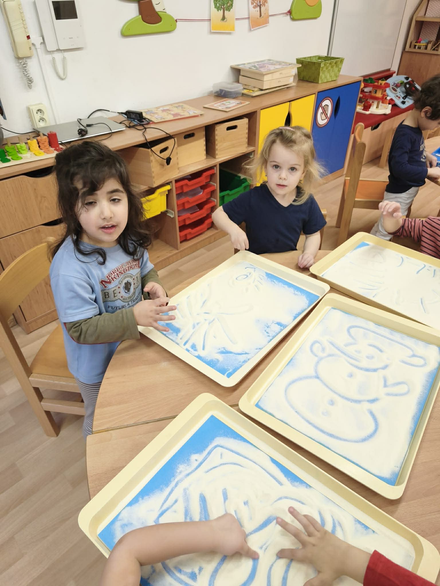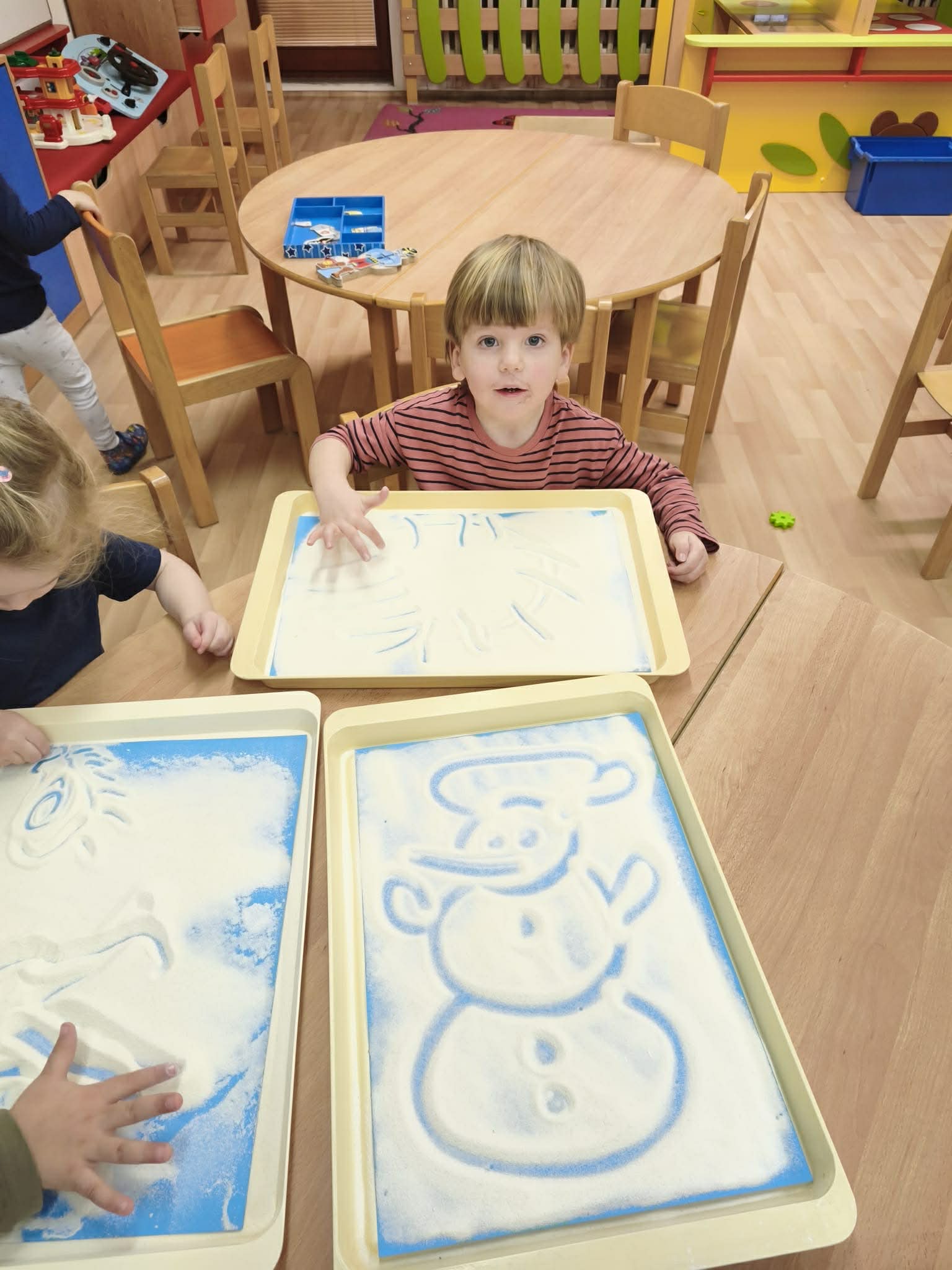 Děti z Medvídků si báječně pohrály s obrázky. Tvořili zvláštní technikou zimní krajinky, sněhuláky nebo pořádné kopce na lyžování a sáňkování.