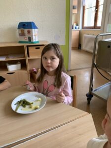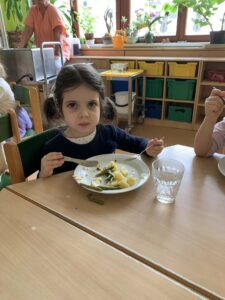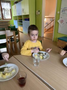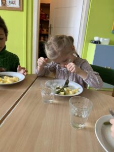 A je to tady …. naše děti se učí baštit jako dospěláci – příborem. Občas se nůž trefuje do pusy, vidlička končí v nose a ta brambora nechce být vidličkou napíchnutá. ……. bude to oříšek, ale my to dáme!