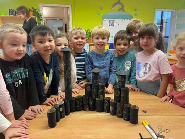 Děti se společně s paní ředitelkou pustily do výroby strašidelného hradu. Lepidlo a nůžky se střídaly mezi prstíky a samozřejmě nechyběla fixa, která dala kouzlo hradu. Práce to byla pěkně složitá , ale název hradu byl na světě hned …. bude to VYŠEHRAD.